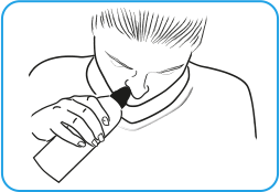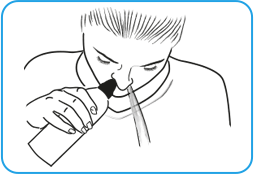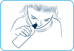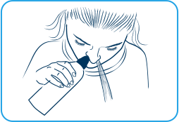 Stań w pozycji lekko nachylonej nad umywalką. Przyłóż końcówkę butelki do jednego z otworów nosowych.